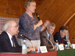 Margolis: Another question that has some peculiar importance to the Northeast Kingdom. This question will first go to Susan Bartlett who sponsored a bill to save a famous moose, whose nickname I will not reveal. I donโt want to get into the details of the situation but one aspect of the legislation that was passed and I believe everyone here voted for it, has created a concern for wildlife officials and not just in Vermont. The law didnโt just save this moose. It transferred the ownership of the moose and 200 white-tailed deer living inside the impoundment up here in Irasburg, transferred to title of those animals to the owner of the land and thatโs a violation of the public trust doctrine, which goes back to about the Magna Carta, which holds that all animals belong to all the citizens of the state. Again, without rehashing the particulars of this case, would each of you as governor uphold the public trust doctrine in the future and will you support officials who are trying to enforce the laws regarding wild animals?