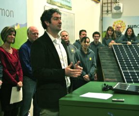 That meant obtaining start-up money from private investors to fund the equipment and hiring a staff of 32 employees, including SunCommon workers and the contracted installer. At the launch, the company showed off a fleet of “environmentally correct” hybrid cars and an electric Chevy Volt, complete with a colorful paint job that includes the company’s logo. Peterson declined to name the investors.