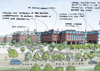 The state was originally given four options on reuse of the 100-acre state office complex in a feasibility study produced by Freeman French Freeman. The administration and the Legislature settled on one called “Option B,” which called for restoration of the historic main spine of the complex, extensive demolition of ancillary and damaged structures, moving the power plant out of the flood zone and building a new state office building at the complex.