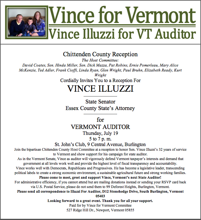 Vincent Illuzzi, a state senator and candidate for state auditor, will hold his first campaign fundraiser next Thursday in Burlington, with an intriguing and impressive host committee that features influential Vermont leaders like David Coates, Ernie Pomerleau, and Paul Bruhn.