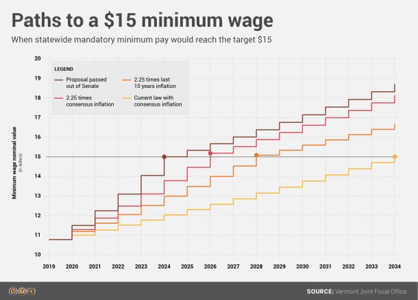 Left-leaning Democrats say the wage needs to increase at nearly double that rate over the next five years in order to help working Vermonters attain a living wage.