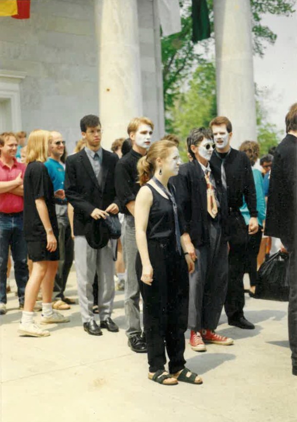 Having reached Old Chapel, organizers ascended its staircase to deliver speeches. Onlookers watch white-faced mimes perform a piece of “guerrilla theater,” organized by McClain, including an abstract re-enactment of staff members being fired and marched out of their offices.