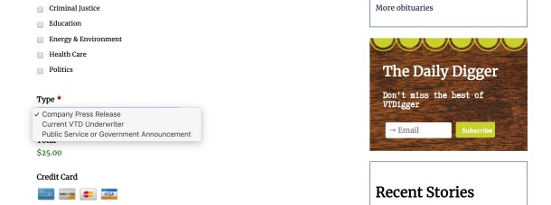 The fee is $25, unless your company is a VTDigger underwriter or government agency, in which case, press releases are free and you can bypass the payment process. For more information about how to become an underwriter, please email Sam Luccie, slucci@vtdigger.org.
