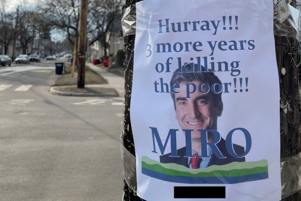 The flyer reads โHurray!!! 3 more years of killing the poor!!! MIROโ over a picture of the mayorโs face. Weinberger won reelection last week, narrowly defeating Progressive City Councilor Max Tracy.