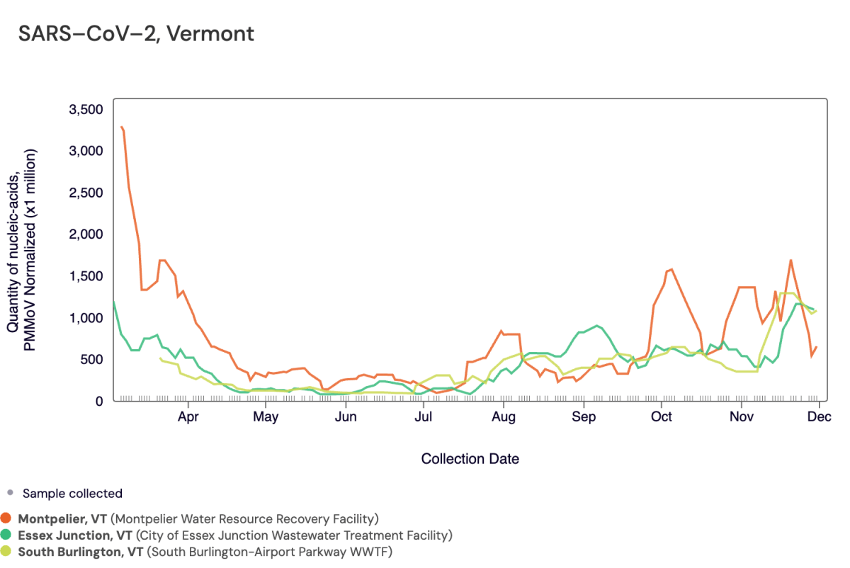 Testing wastewater for Covid in Vermont started in August 2020, when the city of Burlington began looking for the virus at its three treatment plants. The city detected the early presence of Covid variants, such as B.1.1.7 and Delta in 2021.